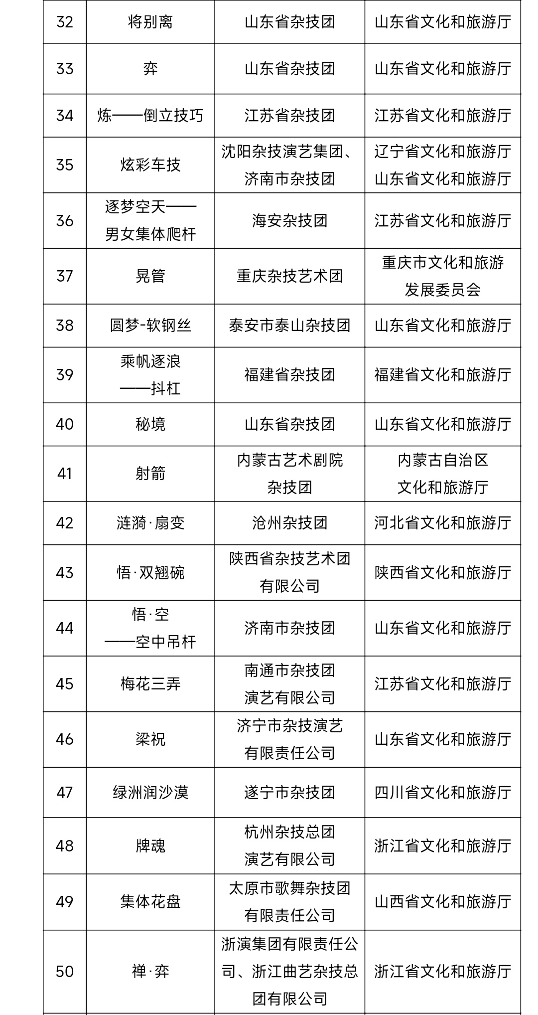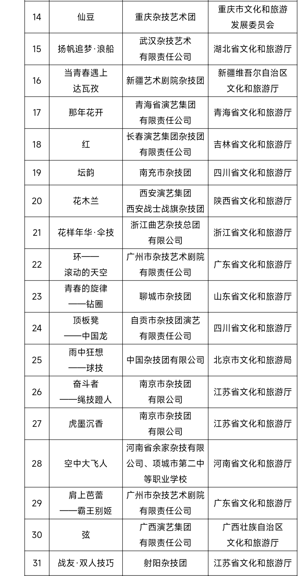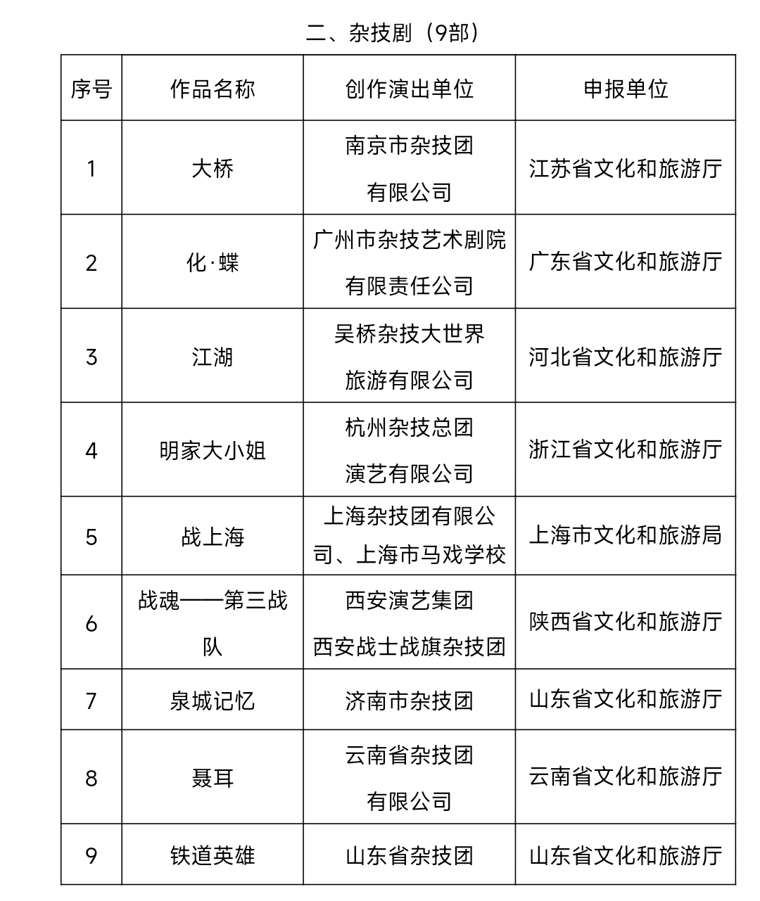 文化和旅游部艺术司关于第十一届全国杂技展演参演作品名单的公示