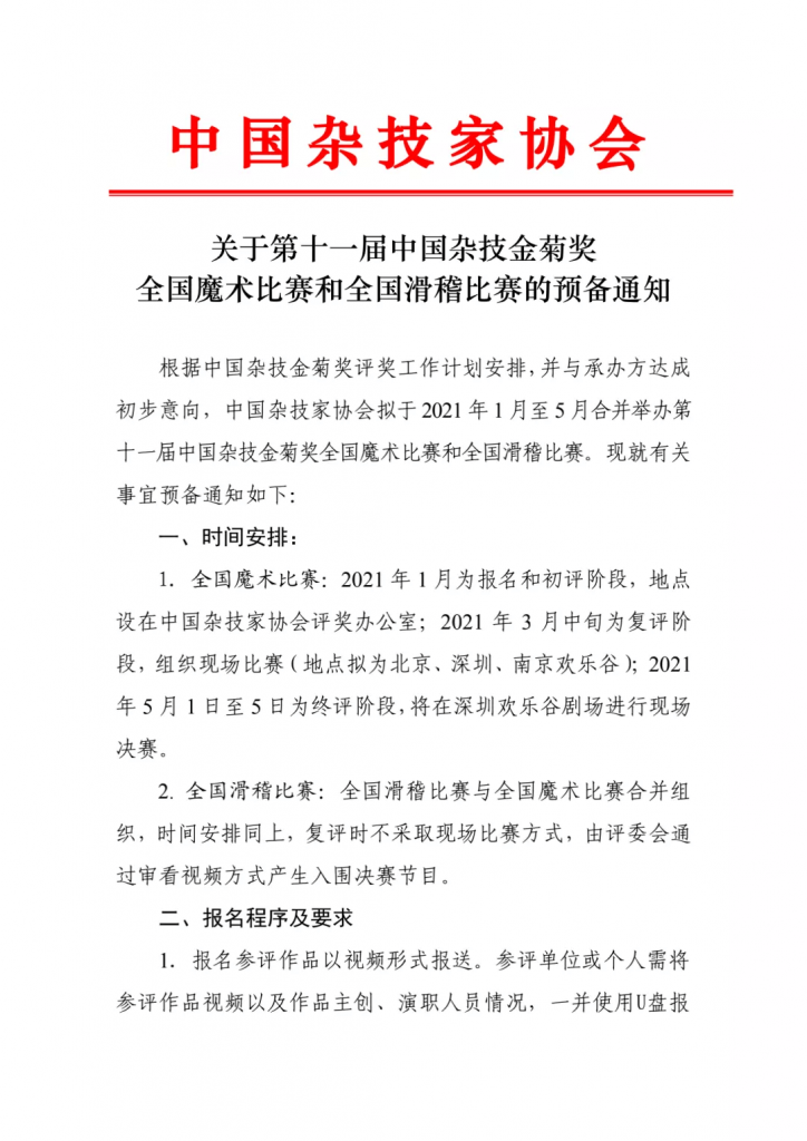 根据中国杂技金菊奖评奖工作计划安排,并与承办方达成初步意向,中国杂技家协会拟于2021年1月至5月合并举办第十ー届中国杂技金菊奖全国魔术比赛和全国滑稽比赛。现就有关事宜预备通知如下: