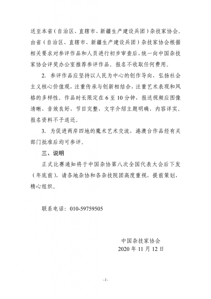 正式比赛通知将于中国杂协第八次全国代表大会后下发(年底前),请各地杂协和各杂技院团高度重视,提前策划精心组织。